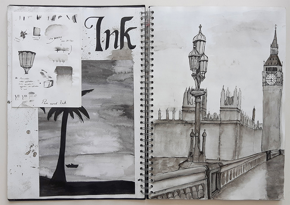 A double page spread from my Alevel coursework sketchbook. The topic for this project was Landscapes. This was some exploration of landscapes using Ink.
