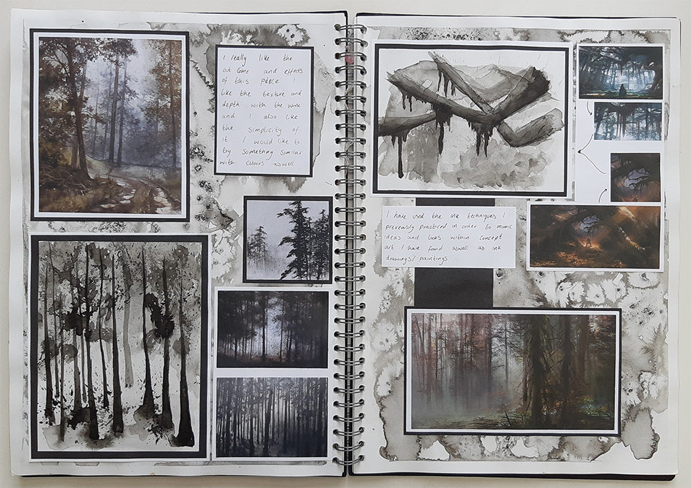 A double page spread from my Alevel coursework sketchbook. The topic for this project was Landscapes. This was some experimentation of recreating some atmospheric concept art using ink.