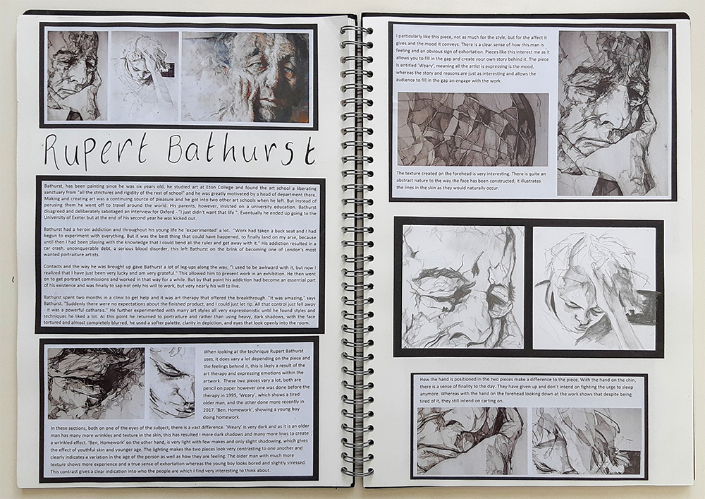 A double page spread from my Alevel exam sketchbook. The topic for this project was work. A study of Rupert Bathurst and his work.
