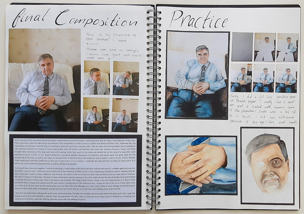 A double page spread from my Alevel exam sketchbook. The topic for this project was work. Both the planning of the composition and a practice paining for my final exam piece.