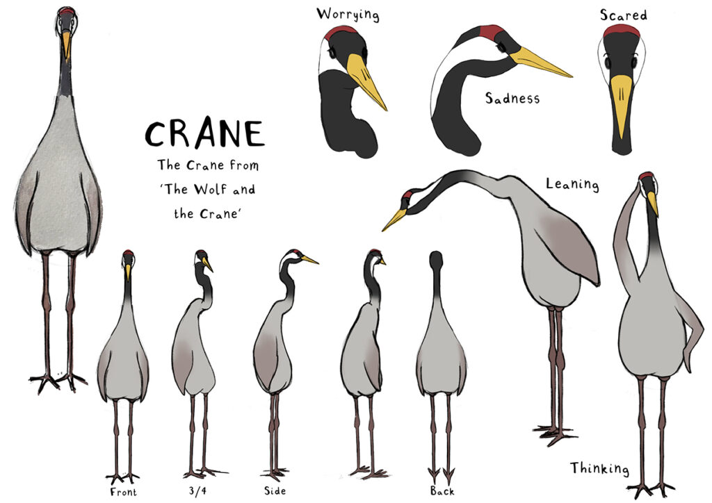 Full character design sheet for the Crane for my illustrated version of The Wolf and the Crane by Aesop. Developing element of my University final major project