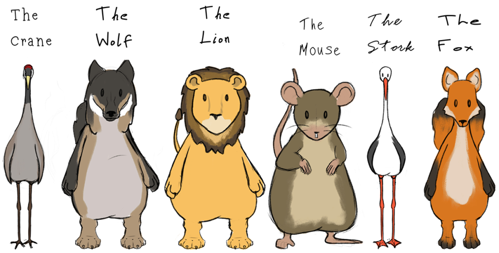 Character designs for an illustrated series of short stories by Aesop. (The Wolf and the Crane, The Lion and the Mouse, and The Fox and the Stork). Developing element of my University final major project