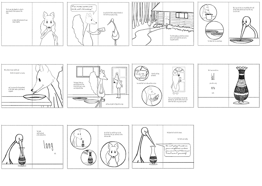 Full flat plan for my illustrated version of The Fox and the Stork by Aesop. Developing element of my University final major project.