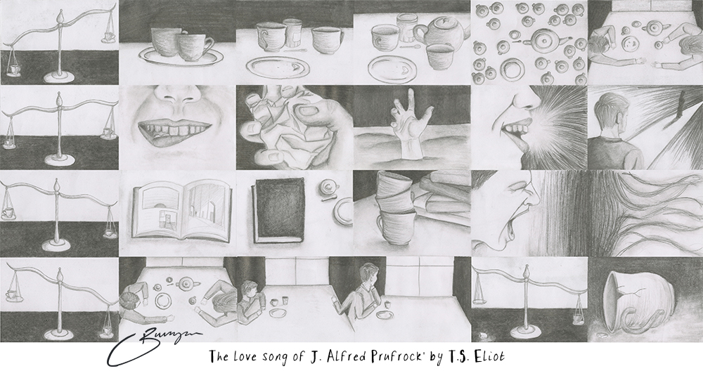University year 1 project - Pencil on paper A storyboard depicting two paragraphs of 'The Love Song of J. Alfred Prufrock' by T.S. Eliot